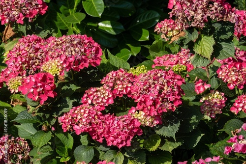 Bright pink hydrangea macrophylla blossoming in garden sunlight