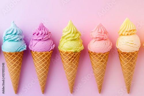 Bright rainbow-colored ice cream cones with glossy textures on a pastel background create a cheerful summer treat display