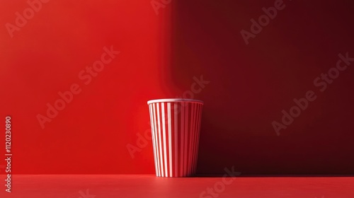 Bright Red Background with Striped Paper Cup Highlighting Minimalist Style and Contrast for Food and Beverage Promotions or Marketing Concepts