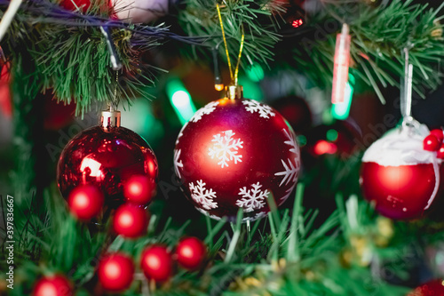 Bright red Christmas toys on the branches of an artificial Christmas tree. Snow balls and berries. A variety of festive accessories shimmer next to colored garlands and lanterns