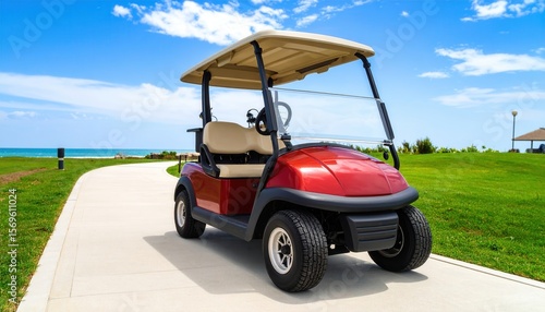 Bright red golf cart parked on a scenic pathway with ocean view and clear blue sky
