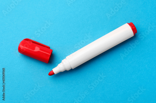 Bright red marker on light blue background, flat lay