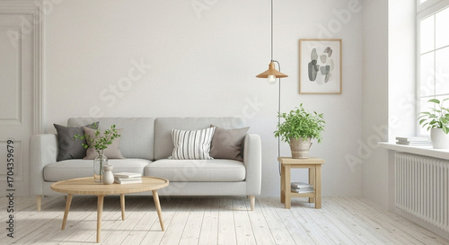 Bright Scandinavian Living Room Interior with a Gray Sofa Wooden Furniture and a Potted Plant by the Window