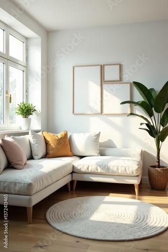 Bright scandinavian living room with minimalist furniture and natural light, natural light, furniture