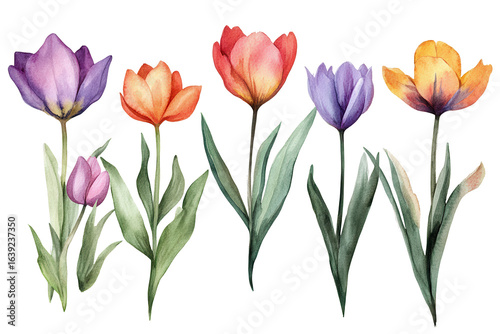 Bright spring flowers collection featuring watercolor designs of tulips in various colors and shapes