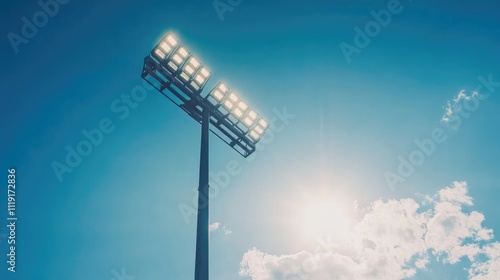 Bright Stadium Floodlights Illuminating a Clear Blue Sky with Sunlight and Fluffy Clouds Creating a Stunning Aesthetic for Sports and Events