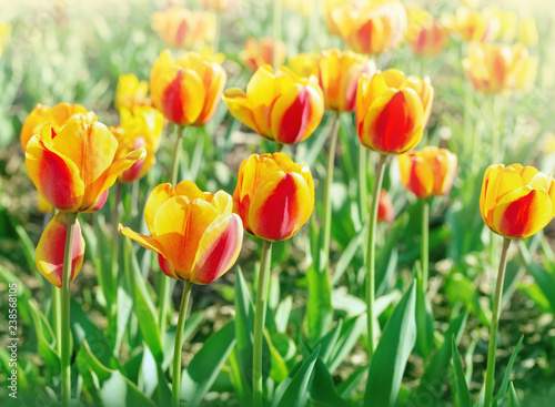 Bright tulips with beautiful sunlight. Red Yellow flowers on flowerbed in spring sunny day. Selective focus.
