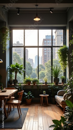 Bright urban jungle children's room interior filled with greenery and natural light, featuring plants, wooden furniture, and city views. Concept focuses on urban jungle children's room design