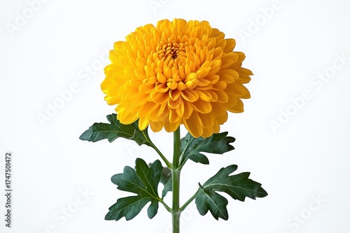 Bright yellow chrysanthemum flower with dark green leaves on a single stem against a clean white background, evoking freshness and natural beauty