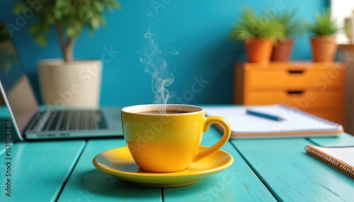 Bright yellow cup of steaming hot coffee sits on teal wooden table next to laptop and notebook. Morning work setup with potted plants in background. Beverage provides energy for busy day.