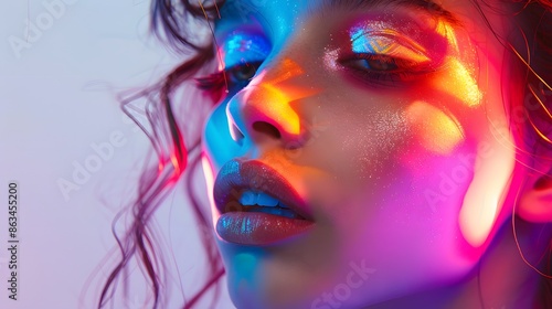 Brightly colored 80s makeup styles highlighted by LED lights., isolated white background, Retro 80s synthwave, Photo stock style, clean background, no copyrighted logo, no letters