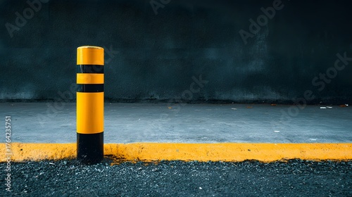 Brightly colored safety barrier stands guard beside a painted curb in a dimly lit urban space