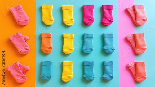 Brightly colored socks arranged in a grid pattern on a vibrant background