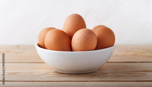 Brown chicken eggs in white ceramic bowl on wooden background. Fresh and natural food.