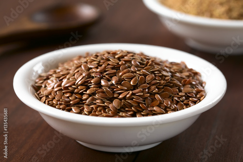 Brown flax seeds or linseeds in small bowl, photographed on dark wood with natural light (Selective Focus, Focus one third into the seeds)