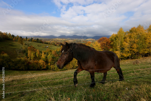 Brown horse grazing grass on a hill in the heart of the mountains in autumn landscape. Beautifull fall view with village and farm animals.