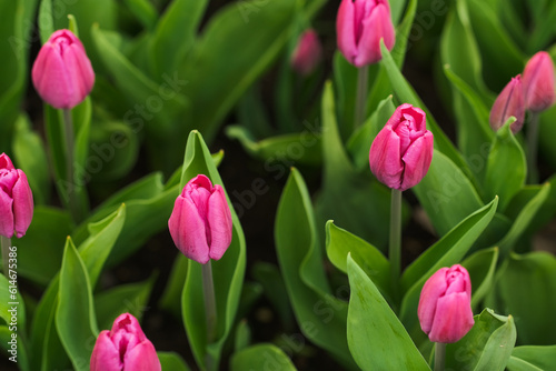 Buds of rose tulips with green leaves in soft lights at blur background topview