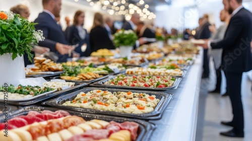 Buffet table with diverse dishes at a formal event, surrounded by elegantly dressed guests, AI