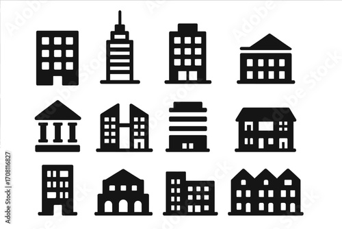Building icon set. Vector collection of urban architecture symbols. Cityscape elements like office, house, bank, and skyscraper in a simple flat minimalist style. Real estate pictograms.