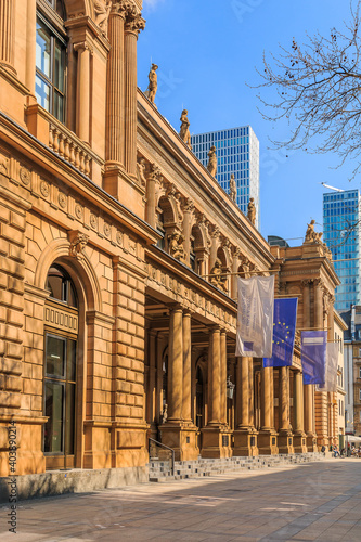 Building of the stock exchange in Frankfurt with flags above entrance. brown colored historical commercial building in baroque style. Skyscrapers in the background. Trees in the foreground in spring