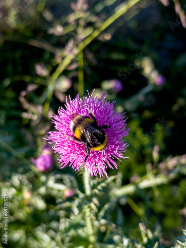 Bumblebee collecting pollen and flower nectar on a purple flower