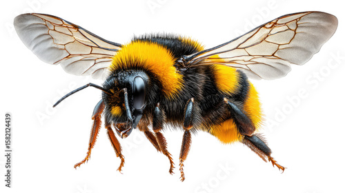Bumblebee in Flight: An up-close, vivid capture of a buzzing bumblebee, showcasing intricate wing details as it hovers in mid-air, a testament to nature's delicate beauty.