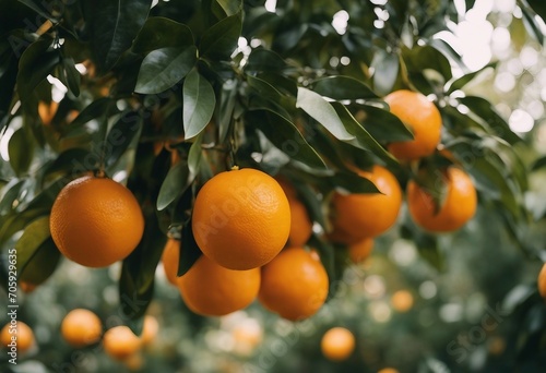 Bunch of fresh ripe oranges hanging on a tree in orange garden close up