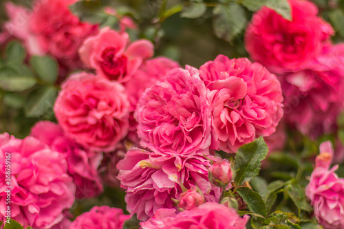 Bunch of pink garden roses on blurry green background. Roses for Valentine Day,Birthday,Anniversary. Fresh flowers background.Beautiful blooming rose close up.Spring flower selective soft focus