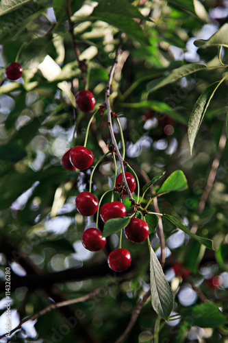 Bunches of ripe cherries on a branch. Selective soft focus. Bokeh in the background