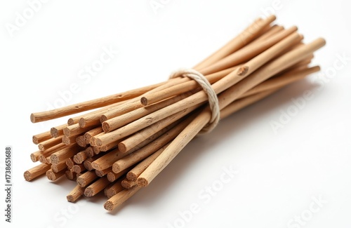 Bundle of thin dry light brown wooden sticks tied with natural twine on white background. They are raw, cut, and uneven lengths for craft or decor.
