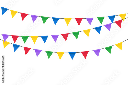 Bunting party flags. Colorful triangles hanging on a rope. Carnival, Festival or Birthday celebration. Vector decoration element.