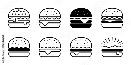 Burger Icon Set Delicious Fast Food Restaurant Menu Vector Illustration Modern Design Elements Different Variations for Culinary Concepts