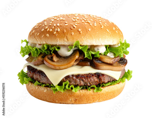 Burger with mushrooms and lettuce on transparent background