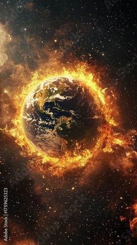 Burning Earth in space, ringed by flames, smoke, and starlight