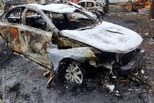 Burnt cars in parking lot, car interior burned. Russia s war against Ukraine, drone attack on Ukrainian city Dnipro, 2025, complete destruction of car, war risk insurance