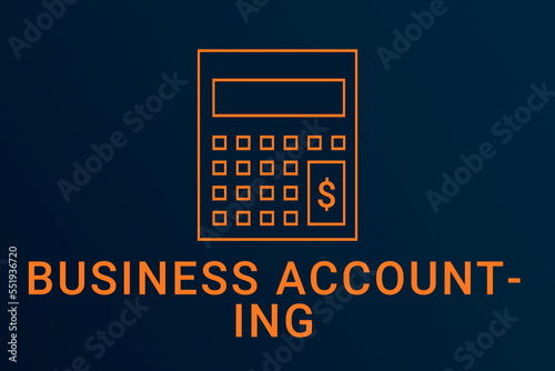 business accounting text. Calculator symbolizes economy. business accounting logo on dark background. Illustration business accounting . Financial screensaver. Minimalist orange calculator