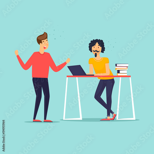 Business characters. Co working people, meeting, teamwork, collaboration and discussion, conference table, brainstorm. Workplace. Office life. Flat design vector illustration.
