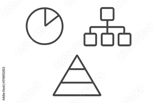 Business chart icon set for data visualization and analysis. Includes pie chart, hierarchy, and pyramid icons for infographics, reports, and presentations. Vector elements.