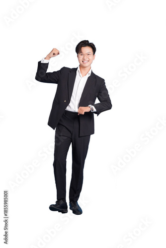 Business Confidence: A self-assured individual in a stylish suit exudes confidence, posing with a triumphant gesture. Capturing the essence of ambition and success.