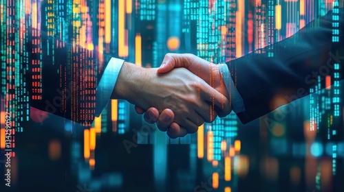 Business Hands Shaking with Digital Data Background and Technology Vibe