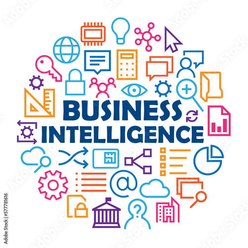 BUSINESS INTELLIGENCE with related icons arranged in a circle on white background