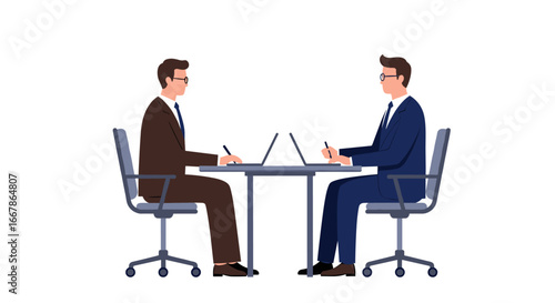 Business meeting concept with two professionals at desk working on laptops