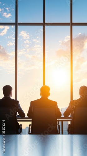Business Meeting Silhouettes Against Sunset Over City Skyline