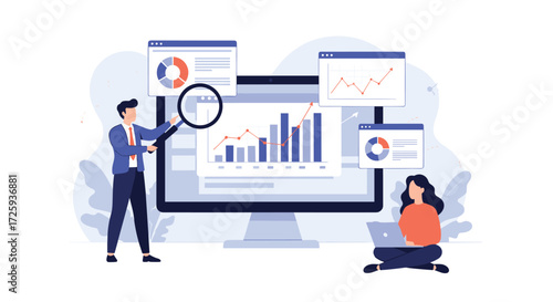 Business people analyze financial data and charts on a computer screen.