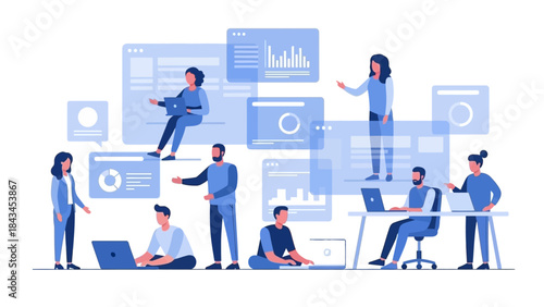 Business people working with digital devices. Office workers using laptops and tablets. Team collaboration with graphs and charts. Vector illustration of employees on white background.