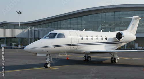 Business private jet airplane parked at terminal. Luxury tourism and business travel transportation concept. Closeup. 3d rendering