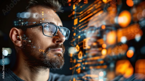 Business professional analyzing AI-powered performance reports on a transparent, Modern office environment utilizing digital insights for strategic decision-making and efficiency improvement.