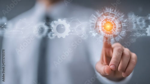 Business Professional Interacting with Futuristic Technology Interface in Modern Office Setting