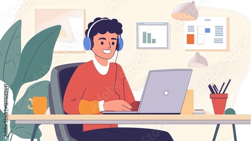 business professional working at a desk with a laptop, smartphone, and headphones in use.