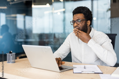 Business professional yawning at desk while using laptop in a modern office